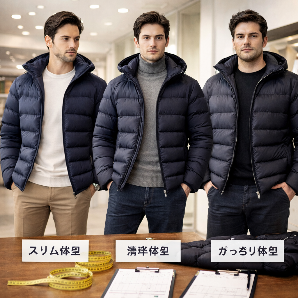 同じ肩幅や身幅であっても、ダウンの封入量や配置、縫製パターン、素材のハリ感によって着心地は大きく変わります。