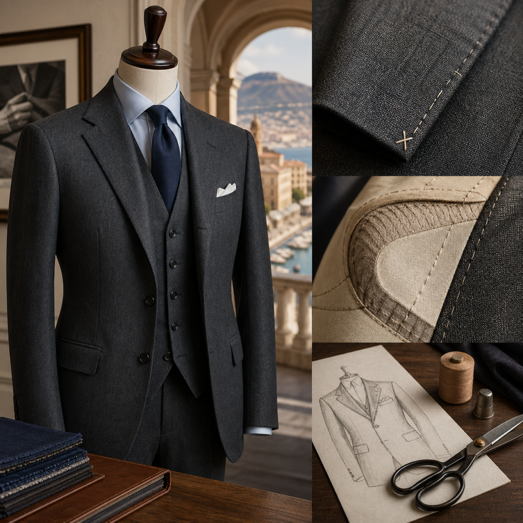 ナポリ仕立ては、柔らかく軽やかな着心地と自然なシルエットを特徴とするイタリア伝統の技法で、英国の構築的なスーツとは対照的です。