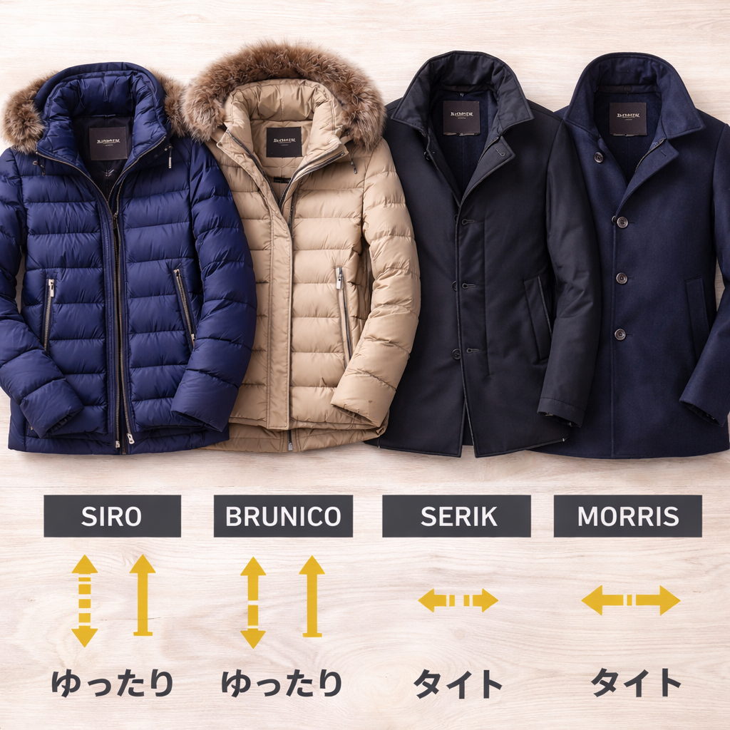 特に、スーツやジャケットの上から着ることを想定したドレス寄りのモデルは、シルエットを美しく見せるためにかなり細身に作られており、肩回りや身幅に余裕が少ない傾向があります。