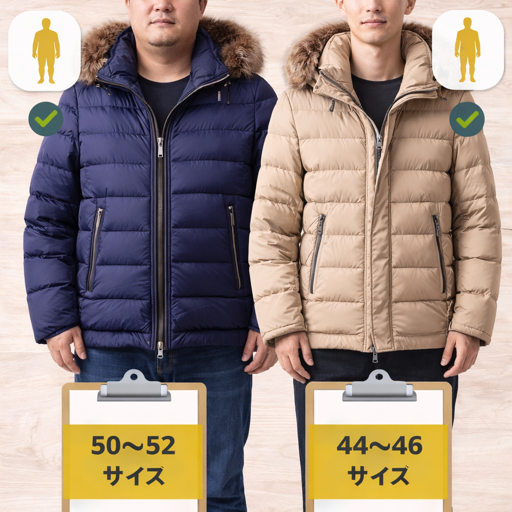 特に中綿量が多い防寒性重視のモデルでは、ダウンがしっかり詰められている分、身体への密着度が高くなり、見た目以上に着用時のフィット感がタイトに感じられることがあります。