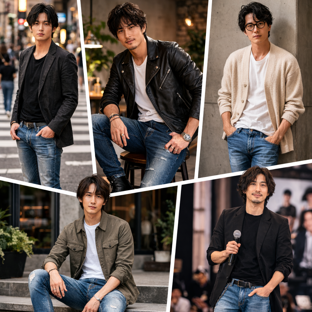 リプレイデニムは細身のシルエットやヴィンテージ加工が特徴で、カジュアルながらも大人っぽい雰囲気を演出できるため、多くの俳優が愛用しています。