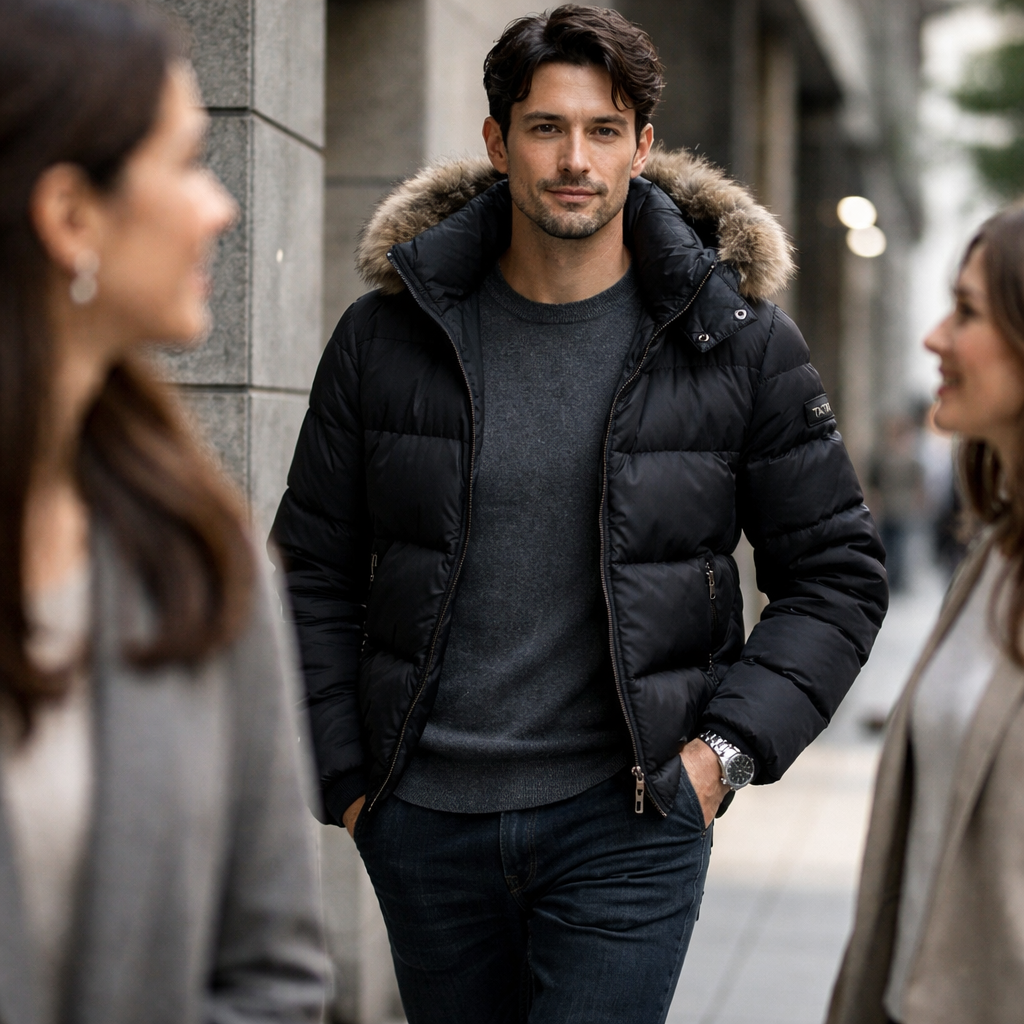 正面からの印象はもちろん、街中ですれ違う一瞬の後ろ姿や横から見たシルエットにおいても洗練された雰囲気を与えやすく、結果として他のダウンを着ている男性との差が視覚的にはっきりと表れるのです。