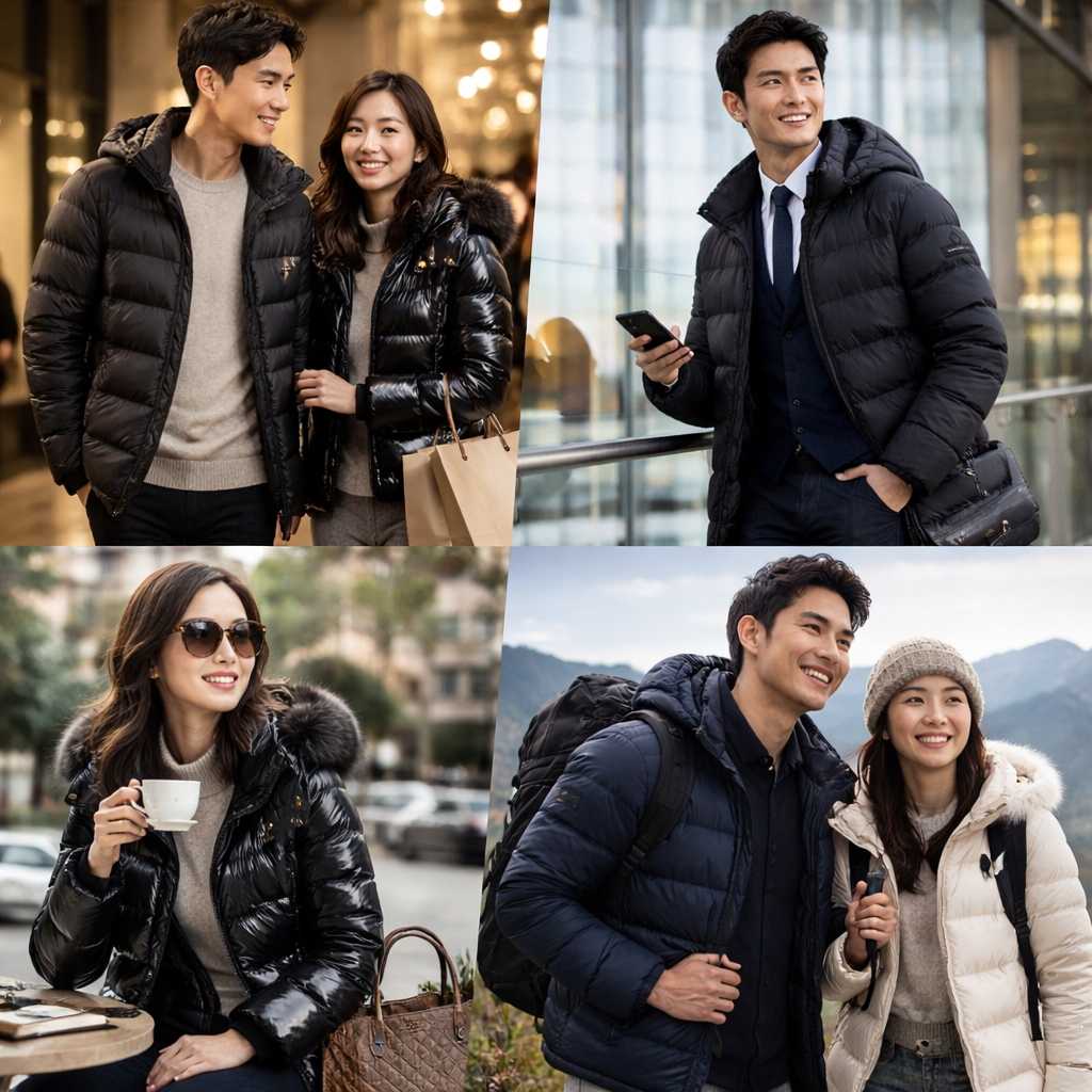 ダウンジャケットでありながら、デニムだけでなくスラックスやジャケットスタイルにも自然に合わせやすく、ビジネスカジュアルやきれいめコーデにも違和感なく溶け込みます。